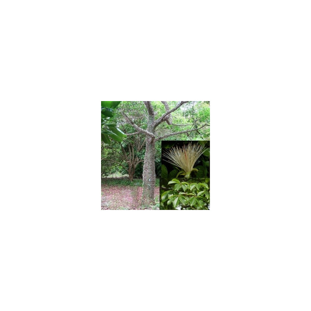 Rychle rostoucí opadavý strom s trnitým kmenem a dlanitě složenými listy. Velké bílé květy jsou složeny z mnoha dlouhých tyčinek.