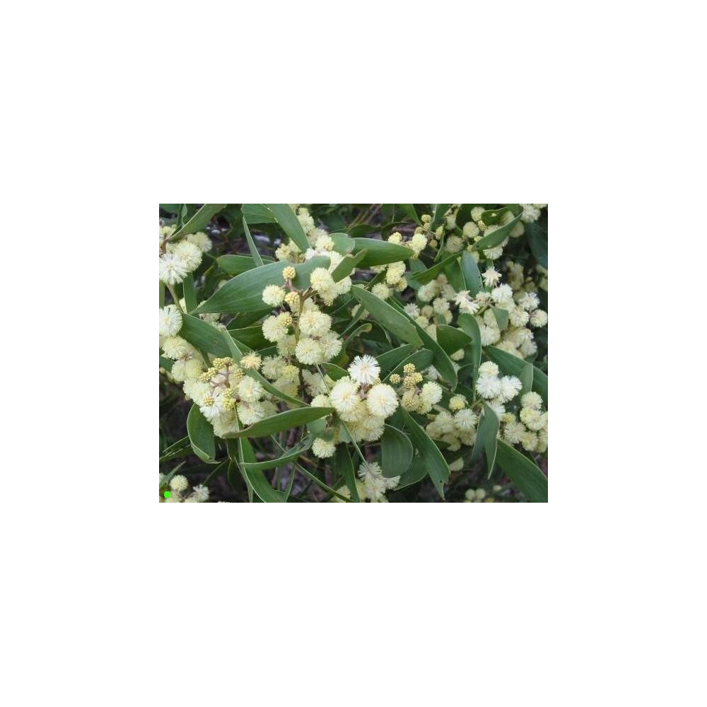 Světle žluté kulovité květy, eliptické listy.