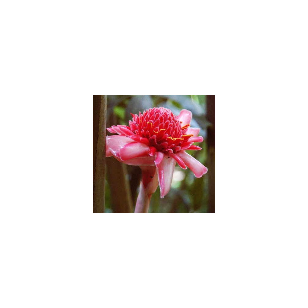 Zázvor, dorůstá do 180 cm, kuželovité růžové květy s bílými nebo zlatými okraji vykvétají na lodyhách, kopinaté listy až 60cm dlouhé jsou ze spodu purpurové, všechny části jsou aromatické