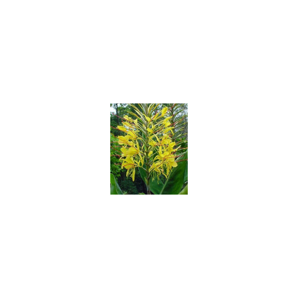 Zázvor, dorůstá do 2m, vonné žluté květy na terminálu, používají se v parfumerii, voskové namodralé listy