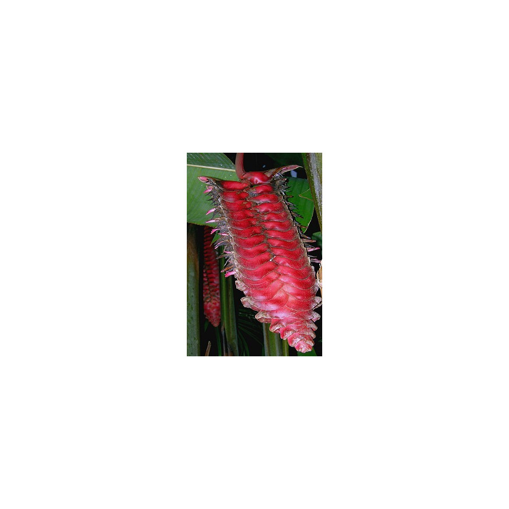 dorůstá do 3-5m, pozoruhodné tmavě červené dlouhé visící květenství, listeny krvavě červené na okraji černé jsou pevně překryté, listy podobné banánovníku