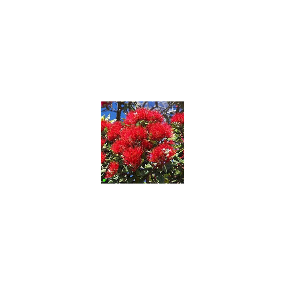 novozélandský vánoční strom, kartáčovité šarlatové květy, zelené vejčité listy na spodní straně šedě plstnaté, vhodný na bonsai