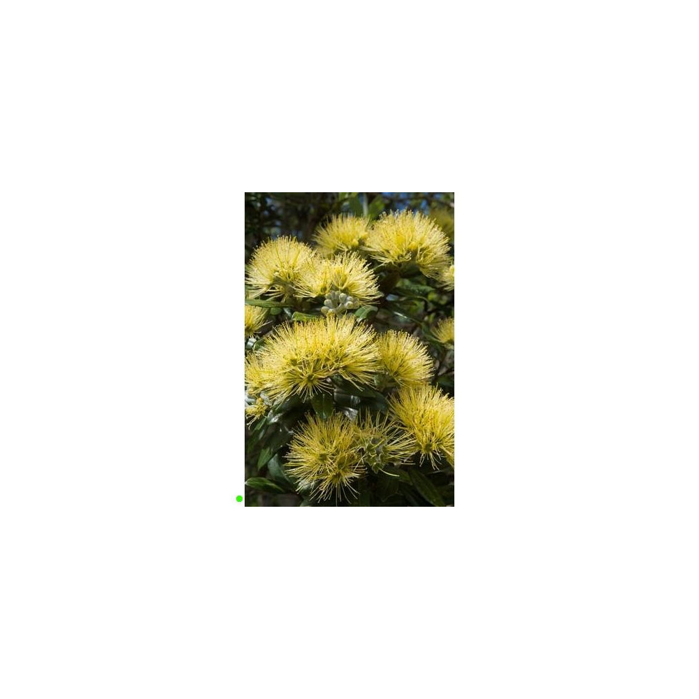novozélandský vánoční strom, vzácný druh, kartáčovité žluté květy, zelené vejčité listy na spodní straně šedě plstnaté, vhodný na bonsai