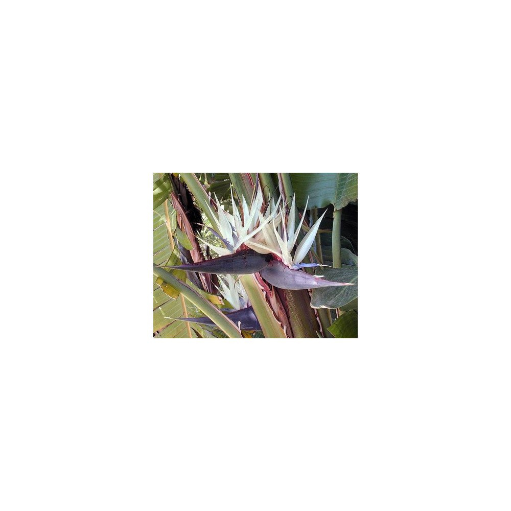 Velké kožovité listy podobné banánovníku, z člunkovitého útvaru vzpřímeně vyrůstají mléčně bílé a modré okvětní plátky 15 cm dlouhé.