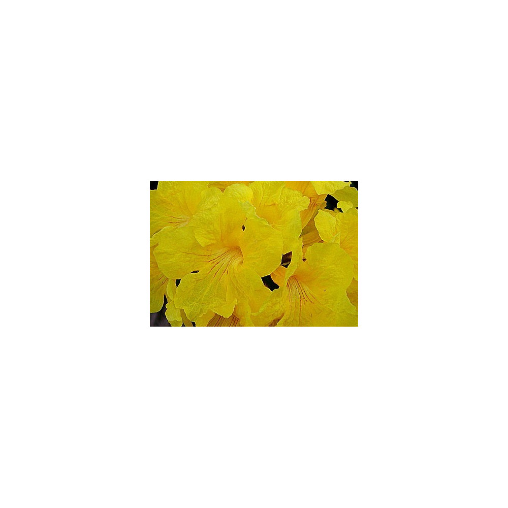 Dlanitolistý keř se zlatožlutými trumpetovými květy s červenou žilnatinou.