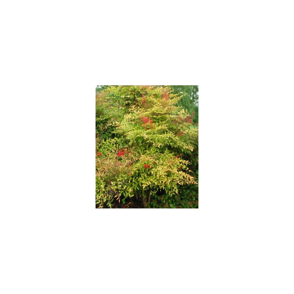 Zelené 3krát zpeřené listy v mládí načervenalé, vykvétá v terminálu mnoha bílými květy, kulaté červené plody 1cm, řadí se mezi bambusy.