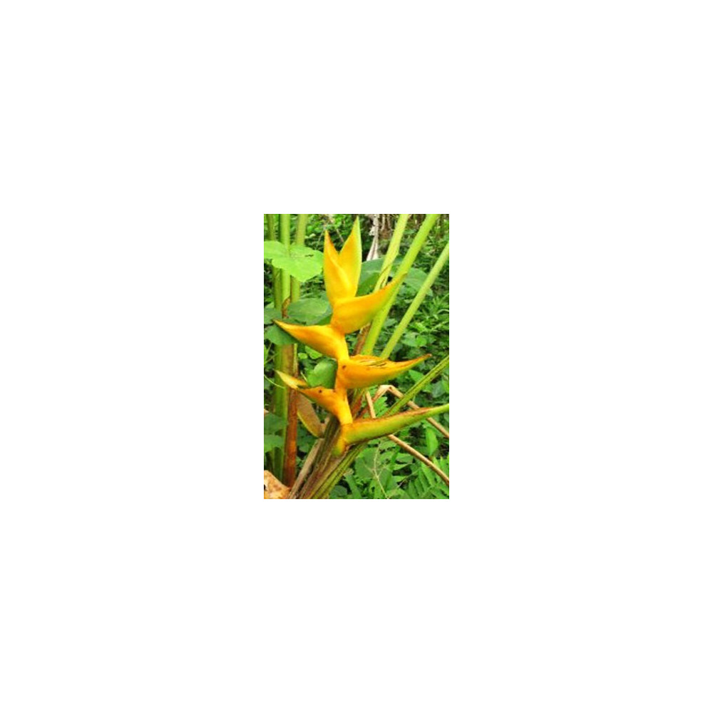 Dorůstá do 3m, vzpřímené člunkovité květenství, zlatožluté až oranžové listeny, listy podobné banánovníku.