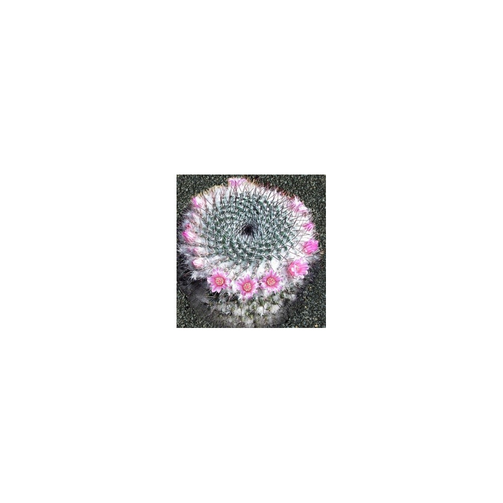 Kulovitý, tmavě zelený kaktus pokrytý bílými chomáčky a jemnými ostny. Žlutohnědé středové trny. Bílé- růžové květy ve věnečku o průměru 1,5cm. Pochází z Mexika.