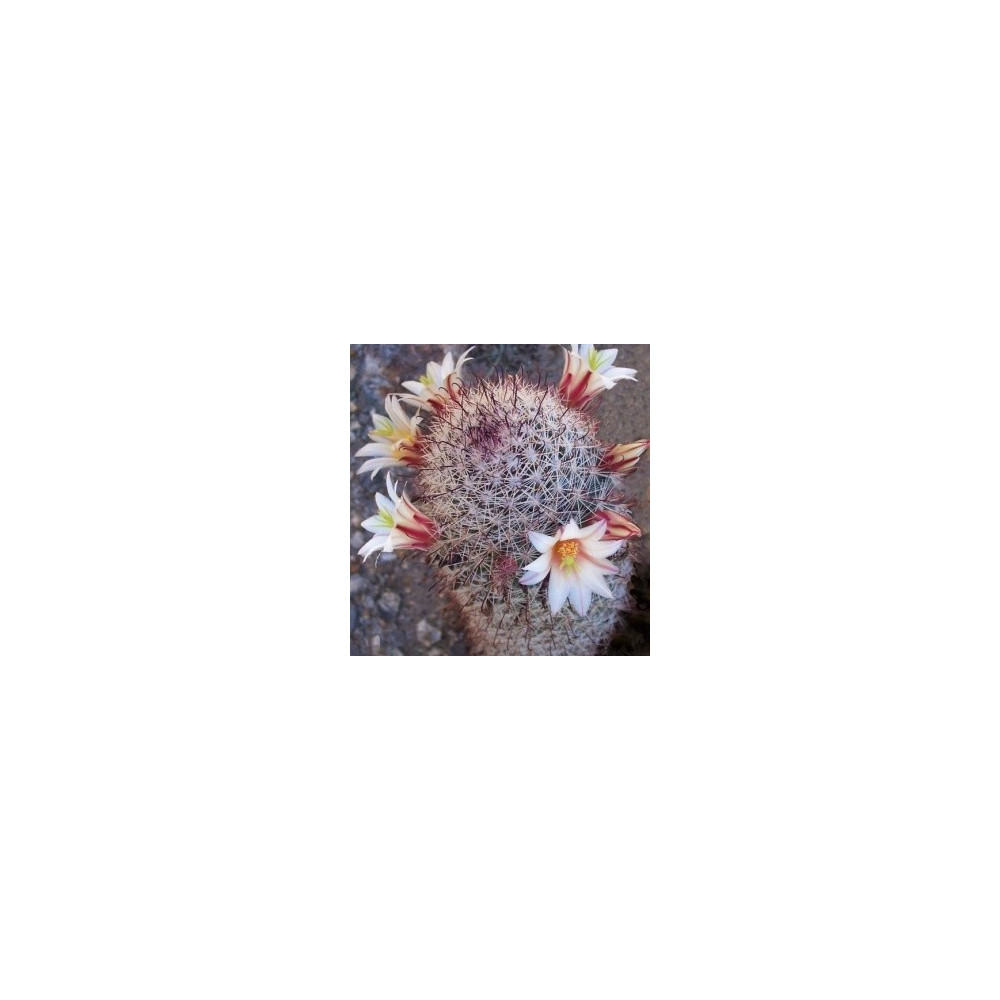 Kulovitý kaktus se zvlněnými tenkými žebry. Bílé-nahnědlé, ploché trny. Světle růžové nebo bílé...