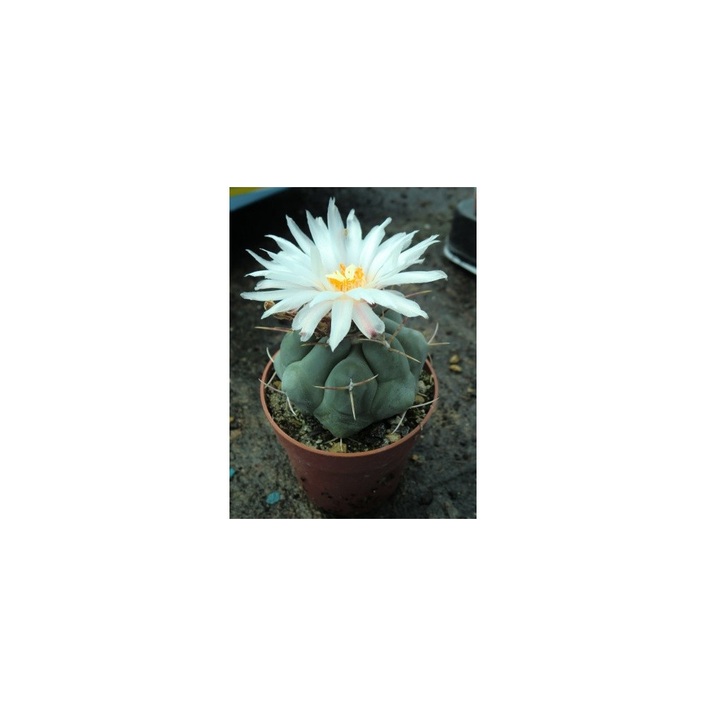 Kulovitý na povrchu zploštělý, šedozelený kaktus. Bílé-načervenalé trny. Bílé květy o průměru 5cm. Pochází z Mexika.