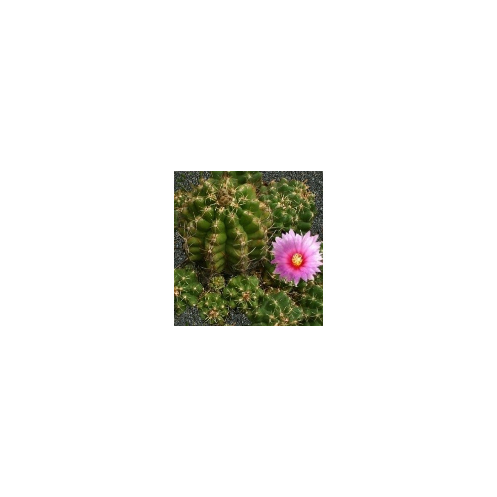 Kaktus s kulovitým až krátce protáhlým tělem se zelenou nebo šedozelenou pokožkou. Růžové květy s...
