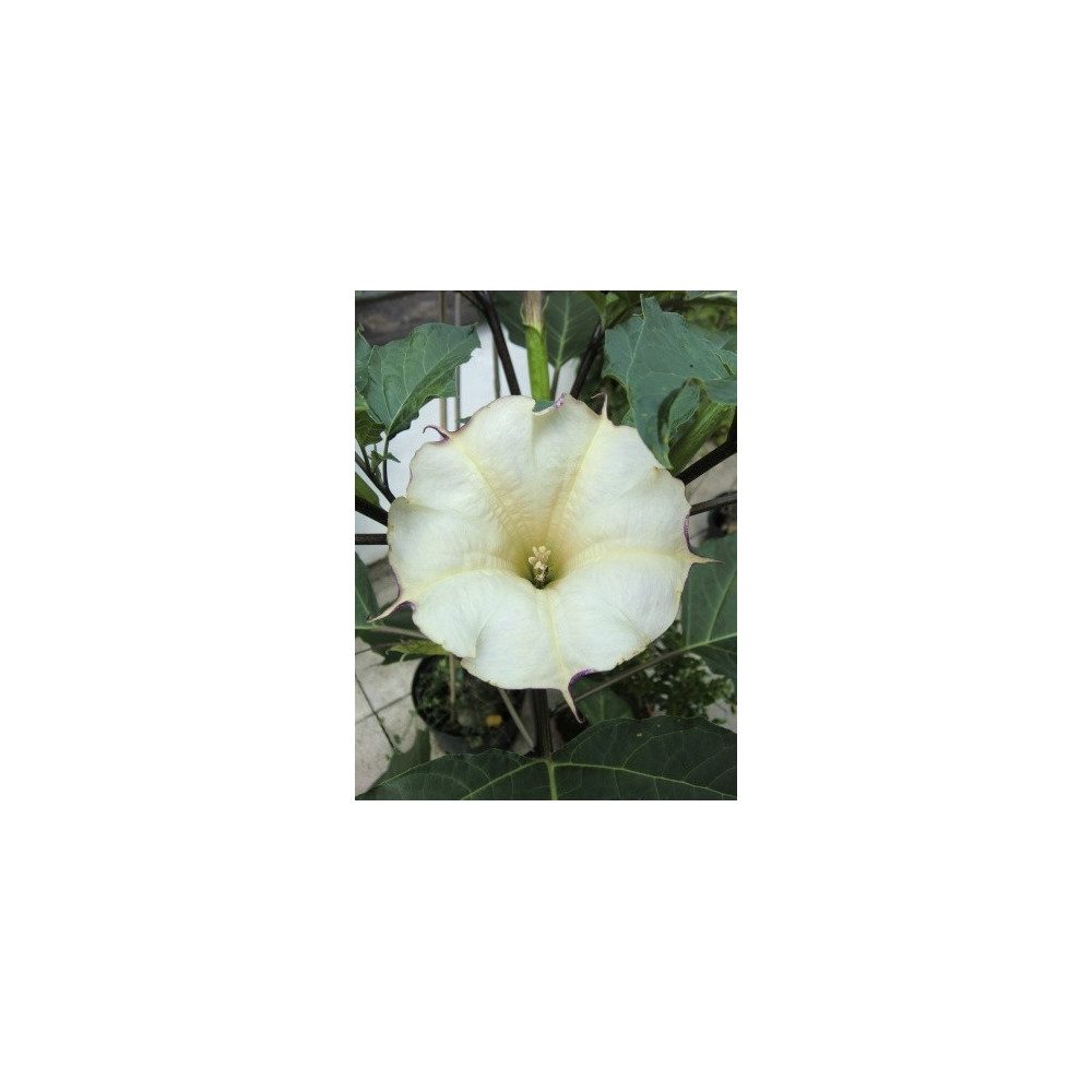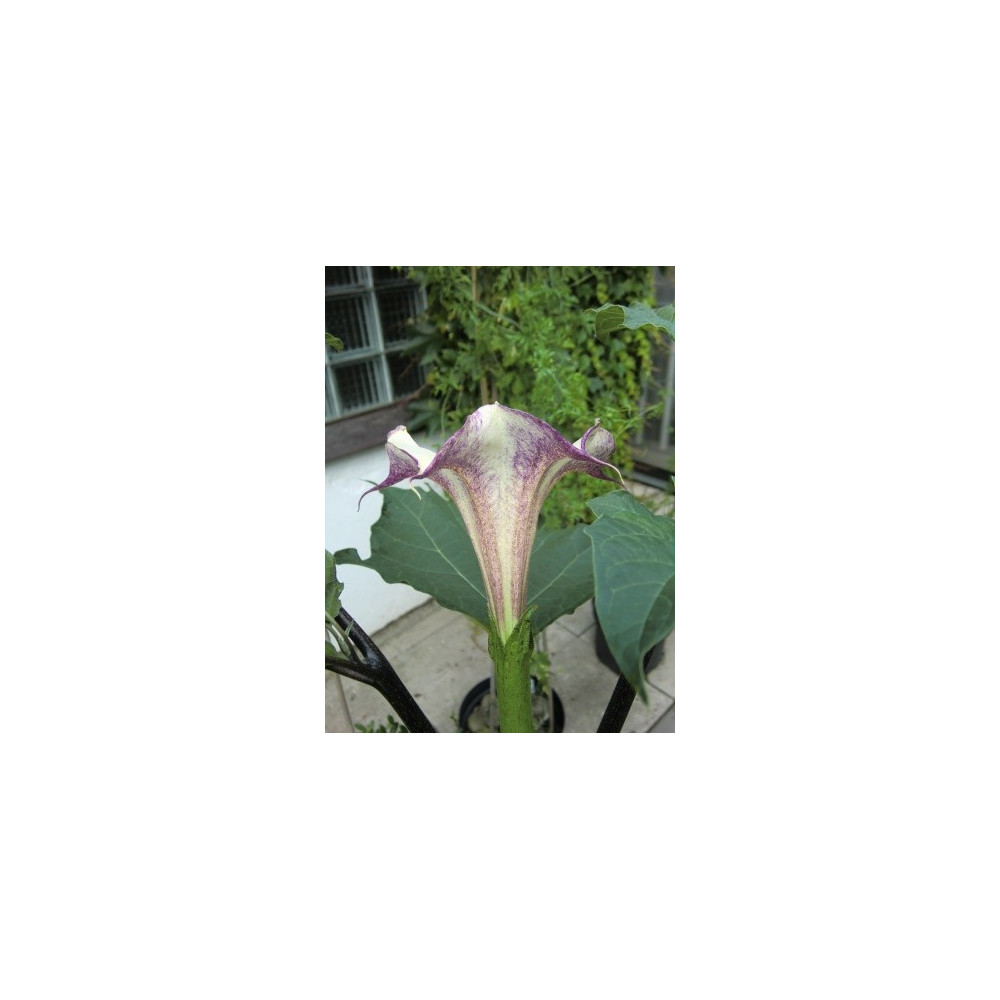 Durman, velké plné květy, uvnitř krémové z vnější strany temně fialové, dekorativní.