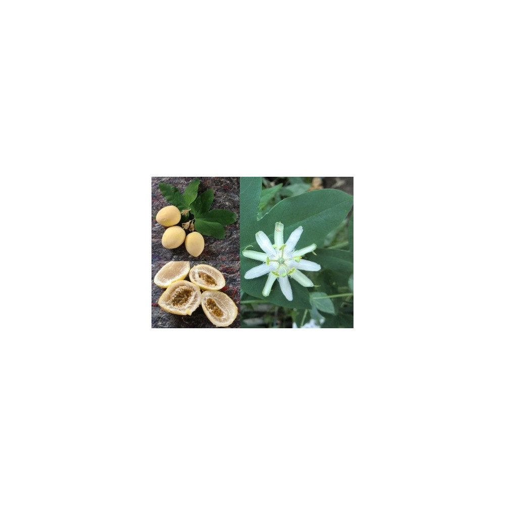 Mučenka, třílaločnaté listy, bílé květy s bílolevandulovými brvami. Jedlé, v plné zralosti žluté plody o velikosti 6cm se sladce chutnající dužinou s česnekovou příchutí obsahují vysoké množství přírodních antioxidantů. Používají se v kosmetickém i farmaceutickém průmyslu. Rostlinu lze pěstovat v našich klimatických podmínkách přes léto venku jako přenosnou. Teplota přes zimu by neměla klesat pod 7°C. Pochází z jižní Ameriky.