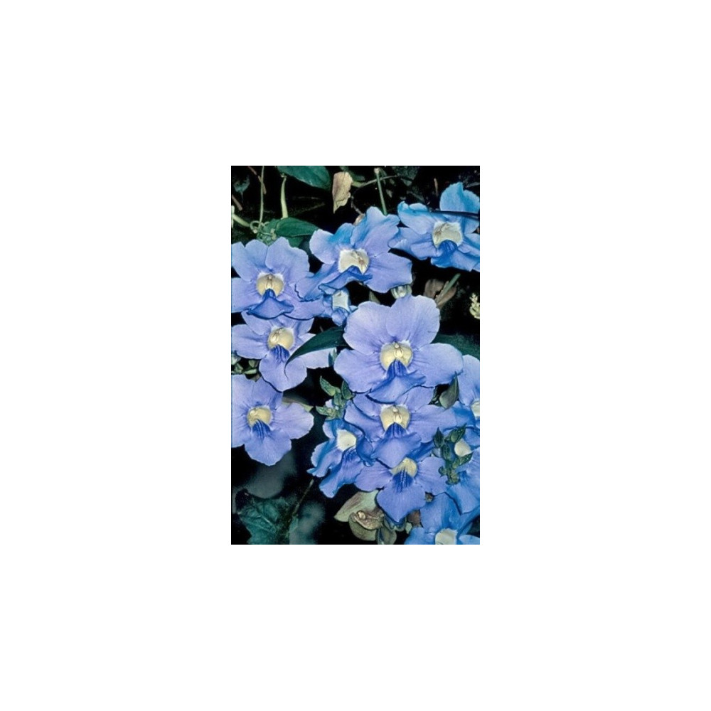 Thunbergie, teplomilná pnoucí trvalka. Velké, krásné, modré květy se žlutým jícnem jsou až 7cm široké a složené do hroznovitého květenství.