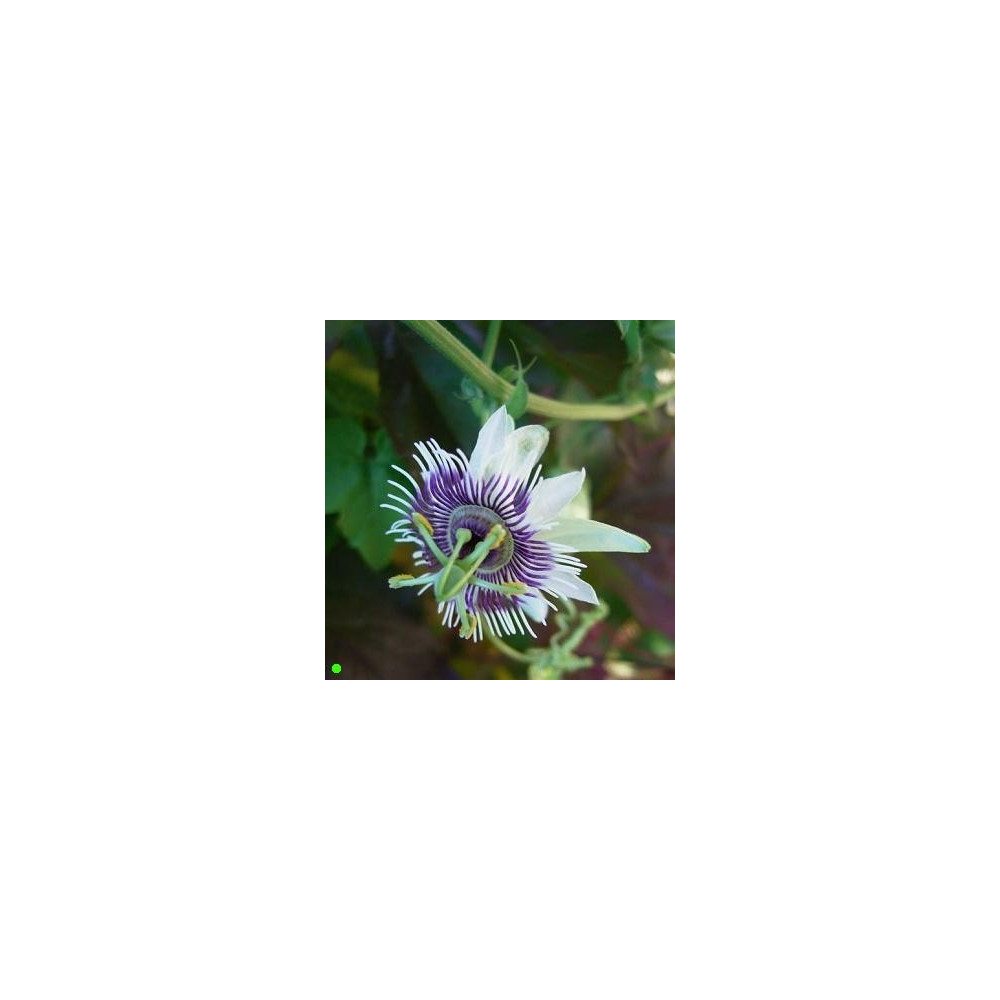 Mučenka, bílé květy 3,5cm široké, korunka s purpurově bílými brvami, oválné 3 – 5cm velké tmavě fialové plody, bohatě kvete