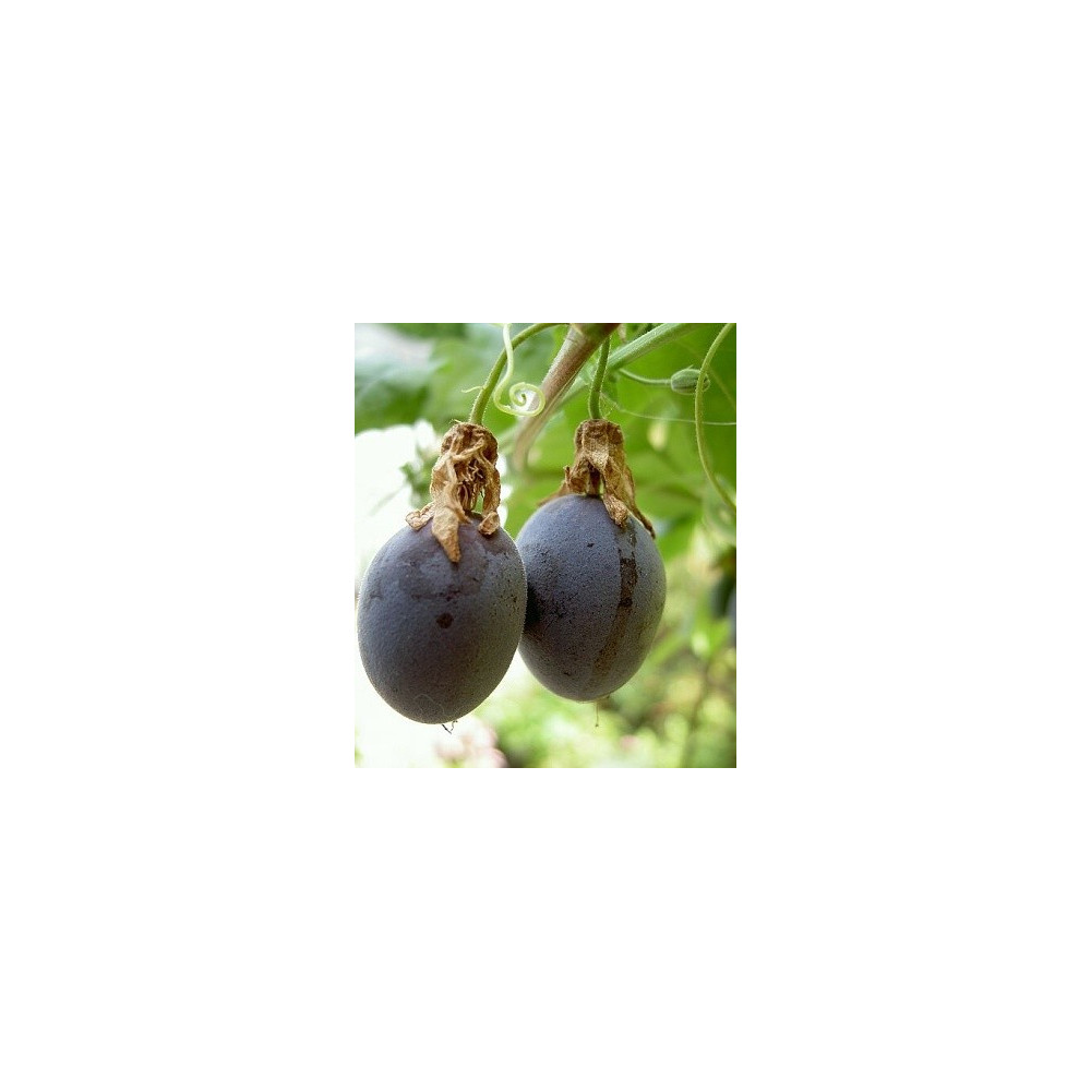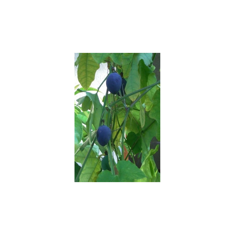 Mučenka, třílaločnaté listy, bílé květy s bílolevandulovými brvami. Jedlé, v plné zralosti žluté...