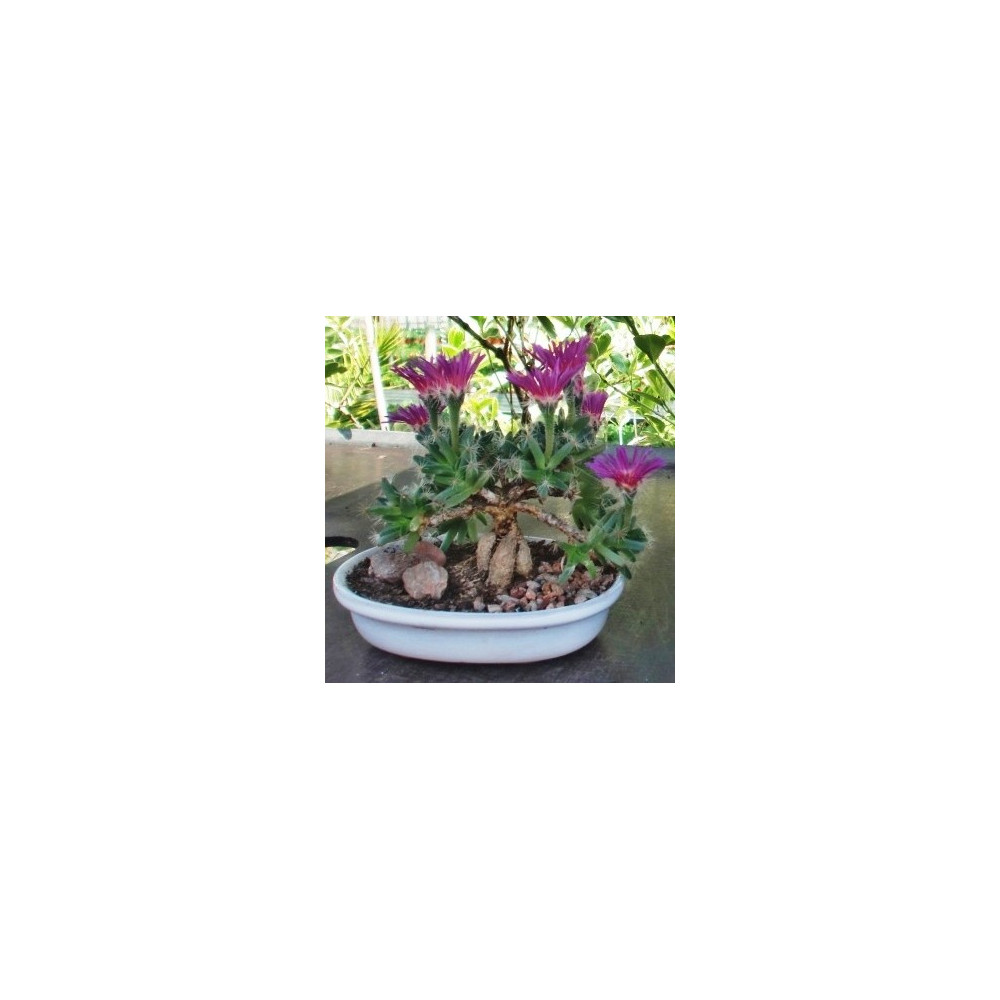 Suchomilná dekorativní rostlina, zelené, plstnaté listy, vytváří kulatý kaudex, trubkovité růžové...