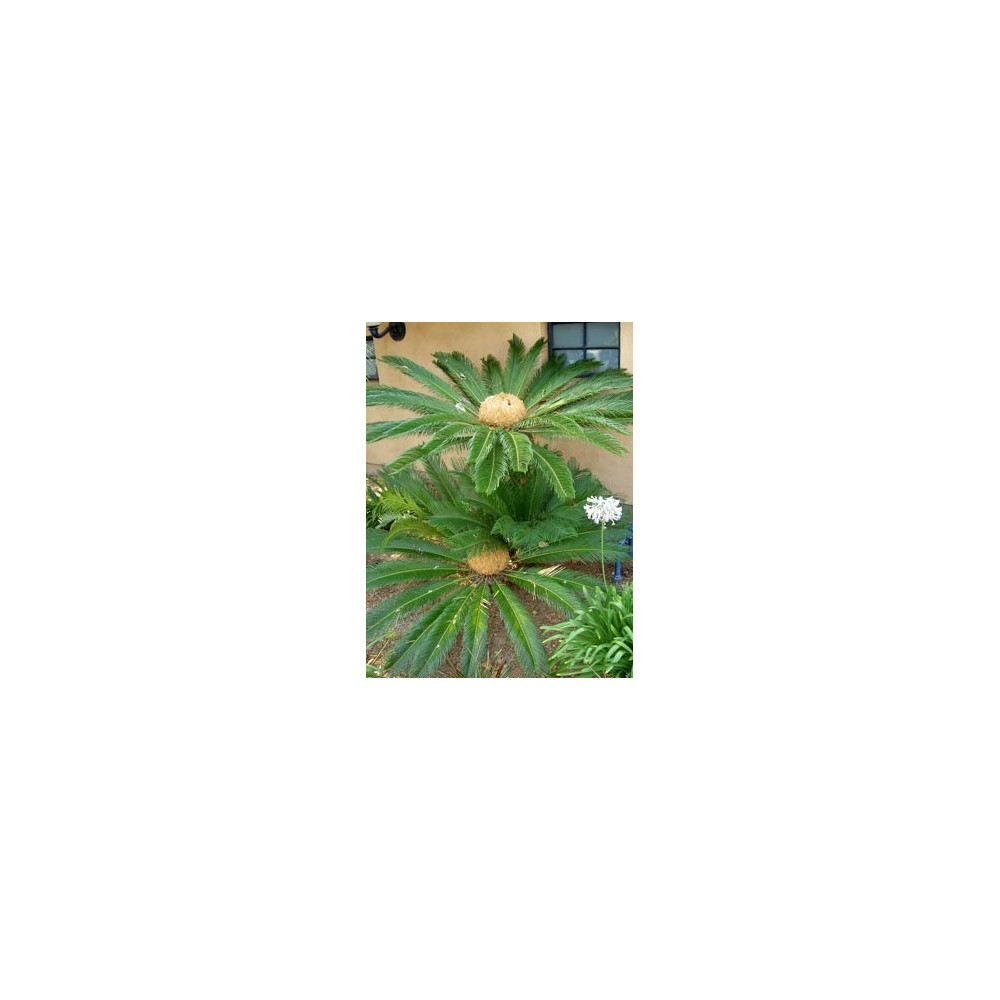 středně velký cykas, světle zelené zpeřené listy s oranžovohnědou hlavou ve středu, ozdobné oranžovočervené plody, pochází z Japonska, velmi dekorativní