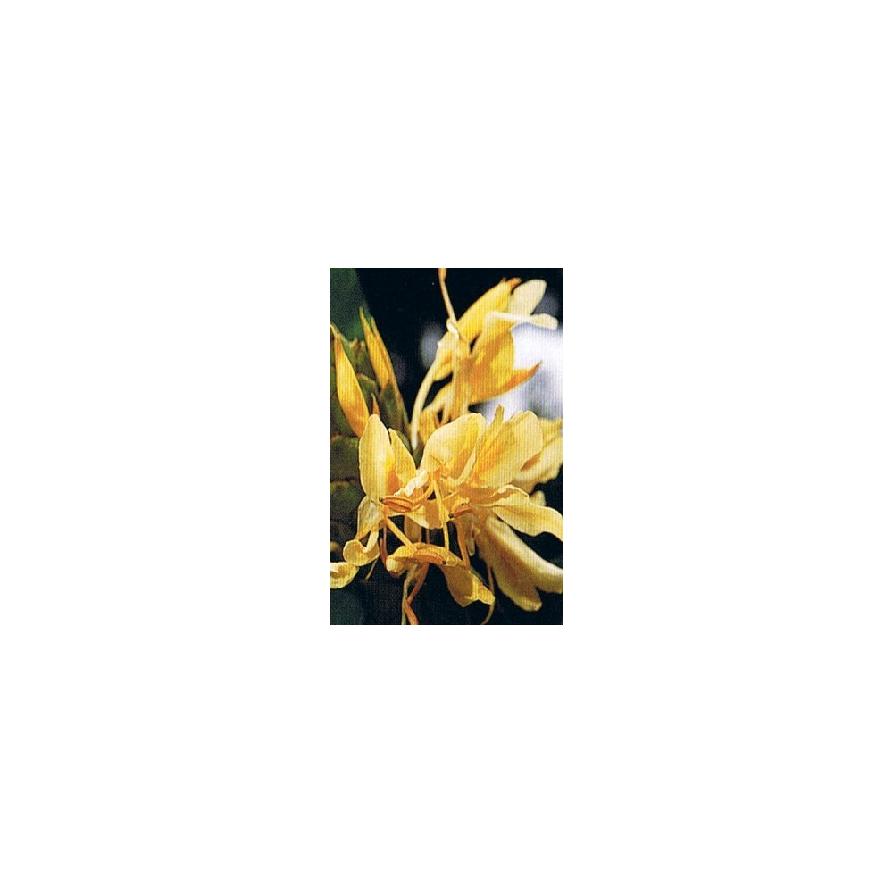 Zázvor, dorůstá do 2m, krémově žluté květy s oranžovou skvrnou, listy do 50cm dlouhé