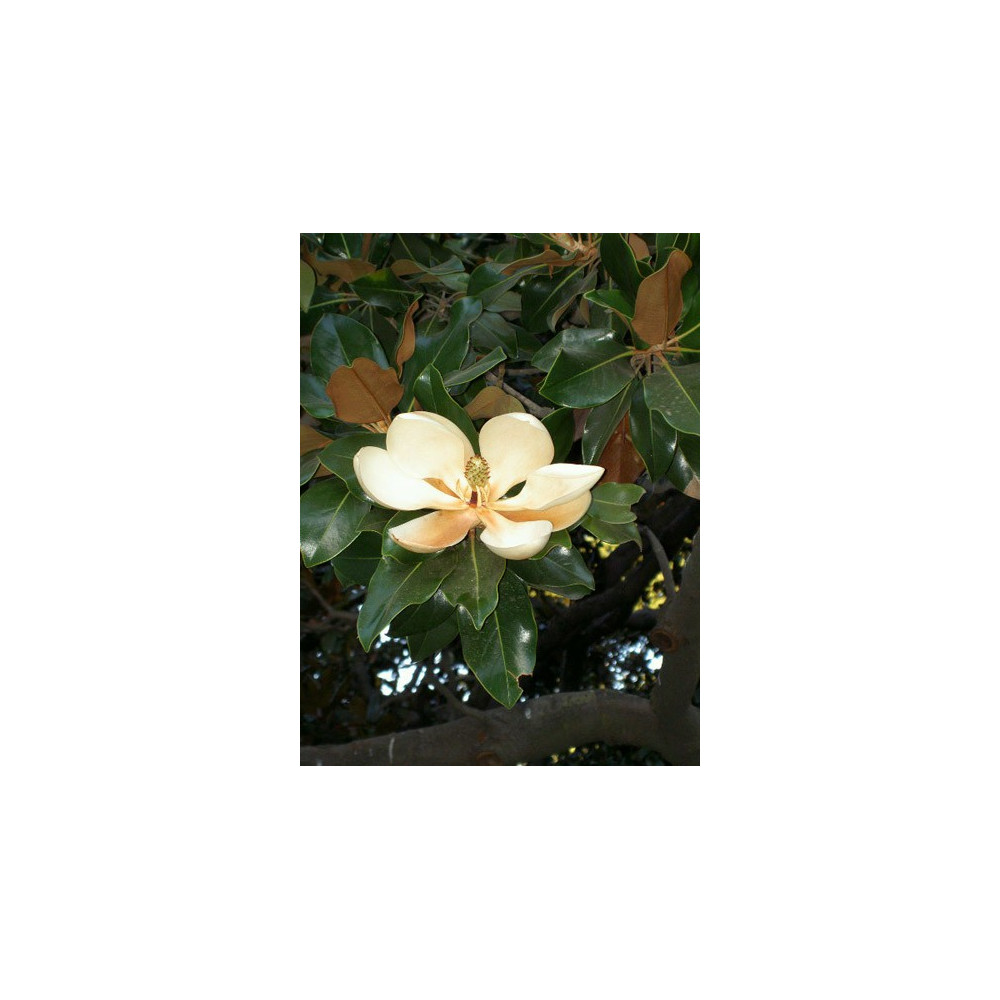 Magnólie, velké vonné krémově bílé květy až 20cm velké, lesklé oválné tmavě zelené listy na spodní straně rezavě plstnaté, mrazuvzdorná do -23°C.