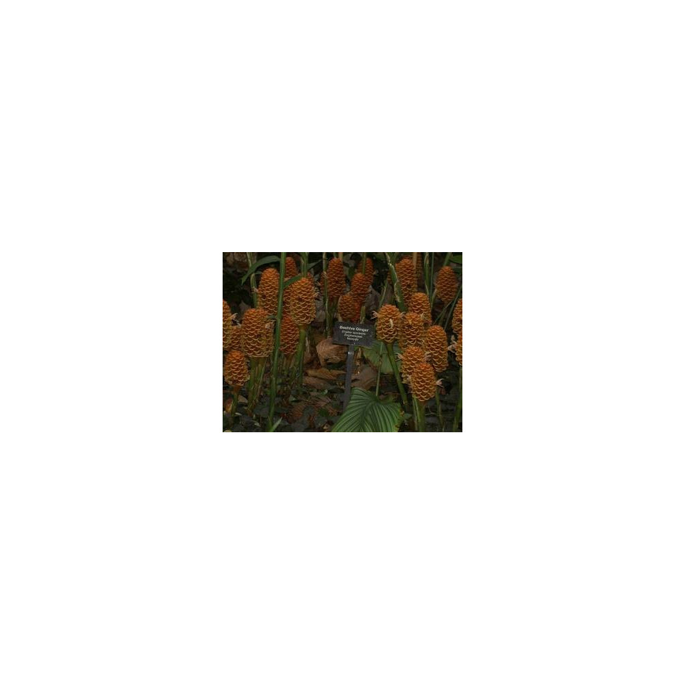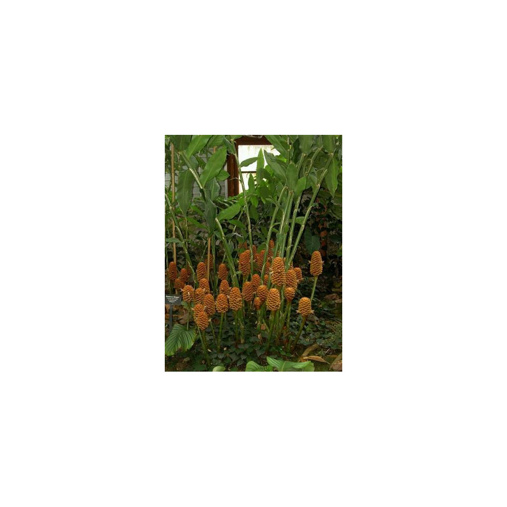 Zázvor, hlíznatá trvalka s kopinatými tmavě zelenými listy. Vytváří kuželovité útvary 20-30cm vysoké se žlutými, později červenými listeny, mezi kterými se objevují malé fialové květy. Pochází z Thajska. V jihovýchodní Asii se pěstuje jako léčivá bylina.