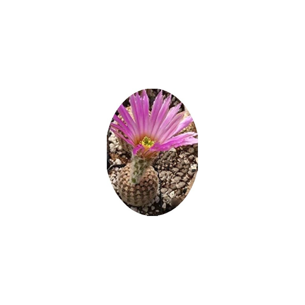 Drobný, bíle hustě otrněný kaktus s kulovitým až zploštělým tělem, vysoký 5cm a široký 4cm. Malé...