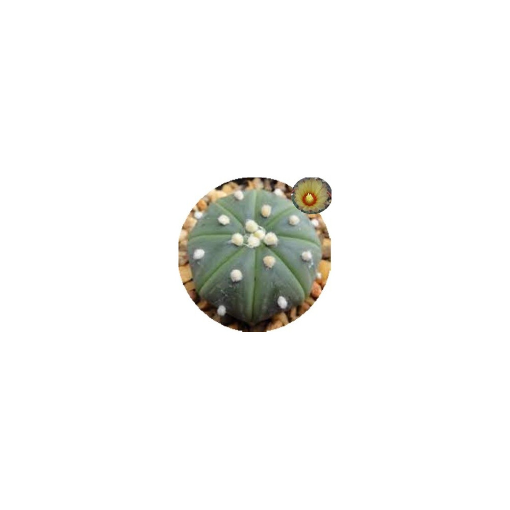 Kulatý- válcový kaktus s modrošedým-zeleným tělem. Nerovné bílé ostny s nahnědlou špičkou....
