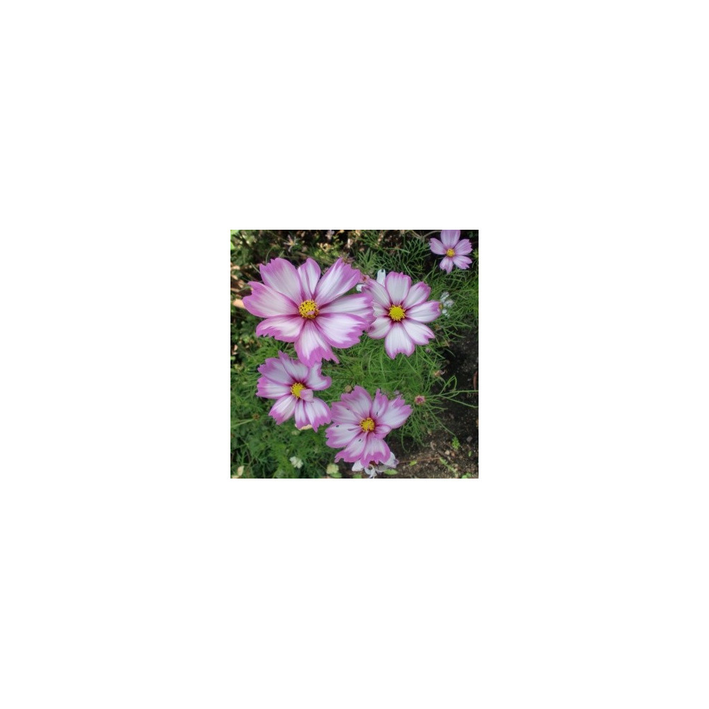 Krásenka zpeřená, letnička na záhon, vhodná i pro řez. Bílé květy s růžovým okrajem a purpurovým zbarvením okolo žlutého středu. Dorůstá 60-70cm.