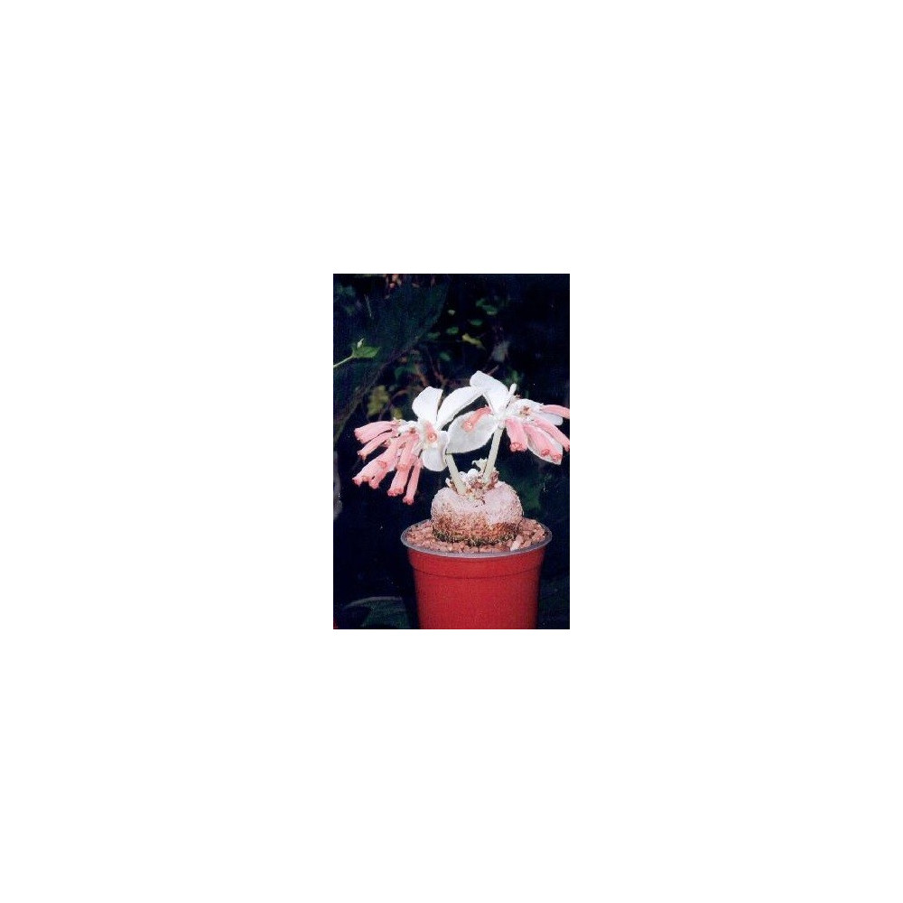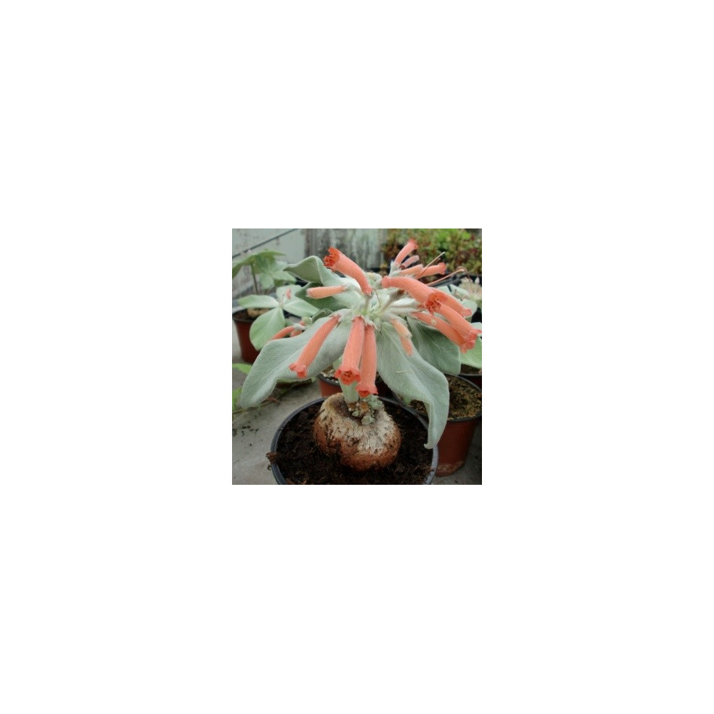 Méně známá suchomilná velmi dekorativní rostlina, šedobílé silně plstnaté listy připomínající samet, vytváří kulatý kaudex, trubkovité růžovočervené květy, velmi drobná semena
