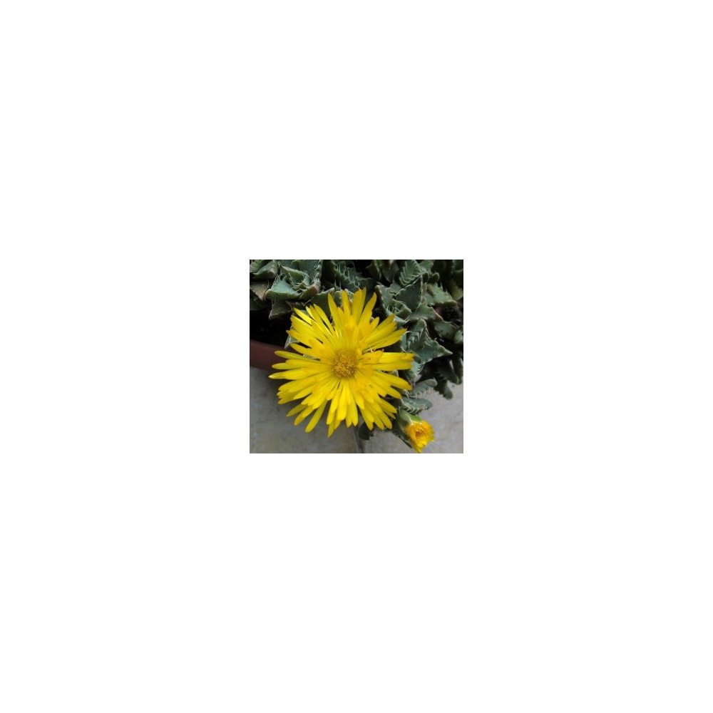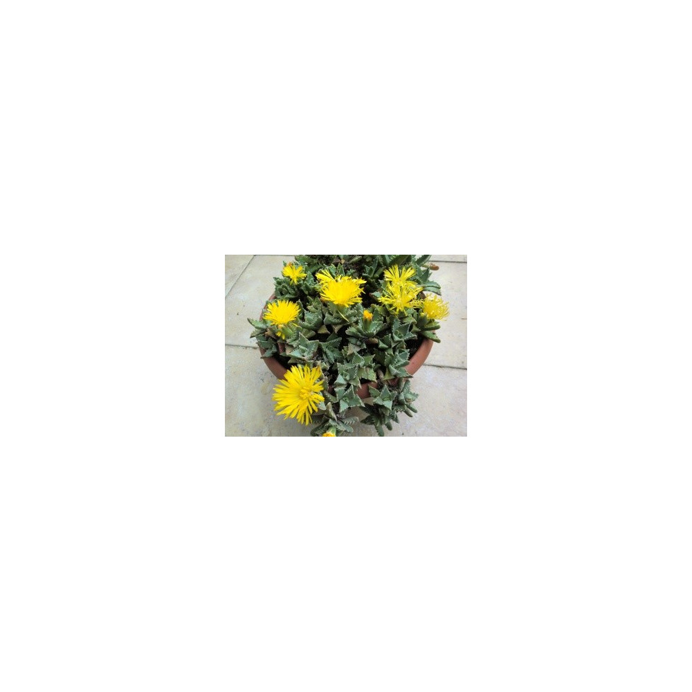 dužnaté krátké listy jsou na povrchu pokryty hrbolky, žluté květy, suchomilný sukulentní druh